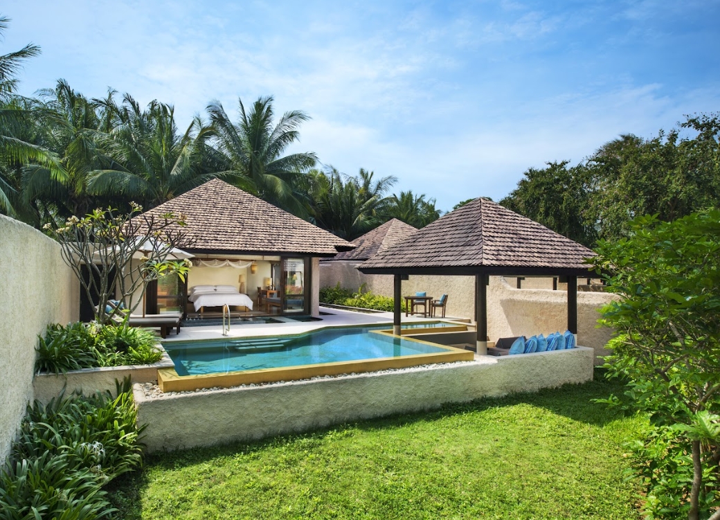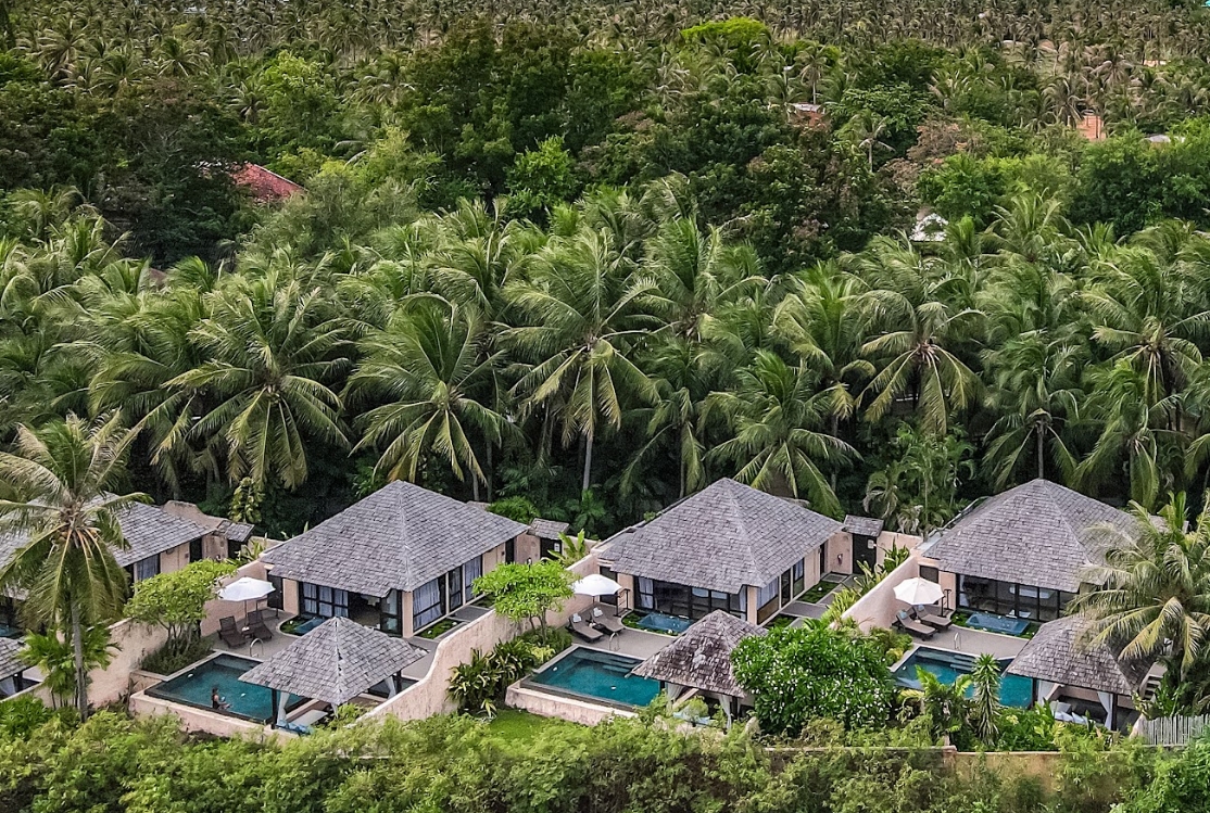 各ヴィラには専用プール、屋外サンケンバスタブ、そしてトロピカルガーデンやタイ湾を一望できる大きな窓が備えられています。インテリアは落ち着いたニュートラルカラーに自然素材を取り入れ、快適な家具とともに、リラックスできる静かな雰囲気を演出しています。