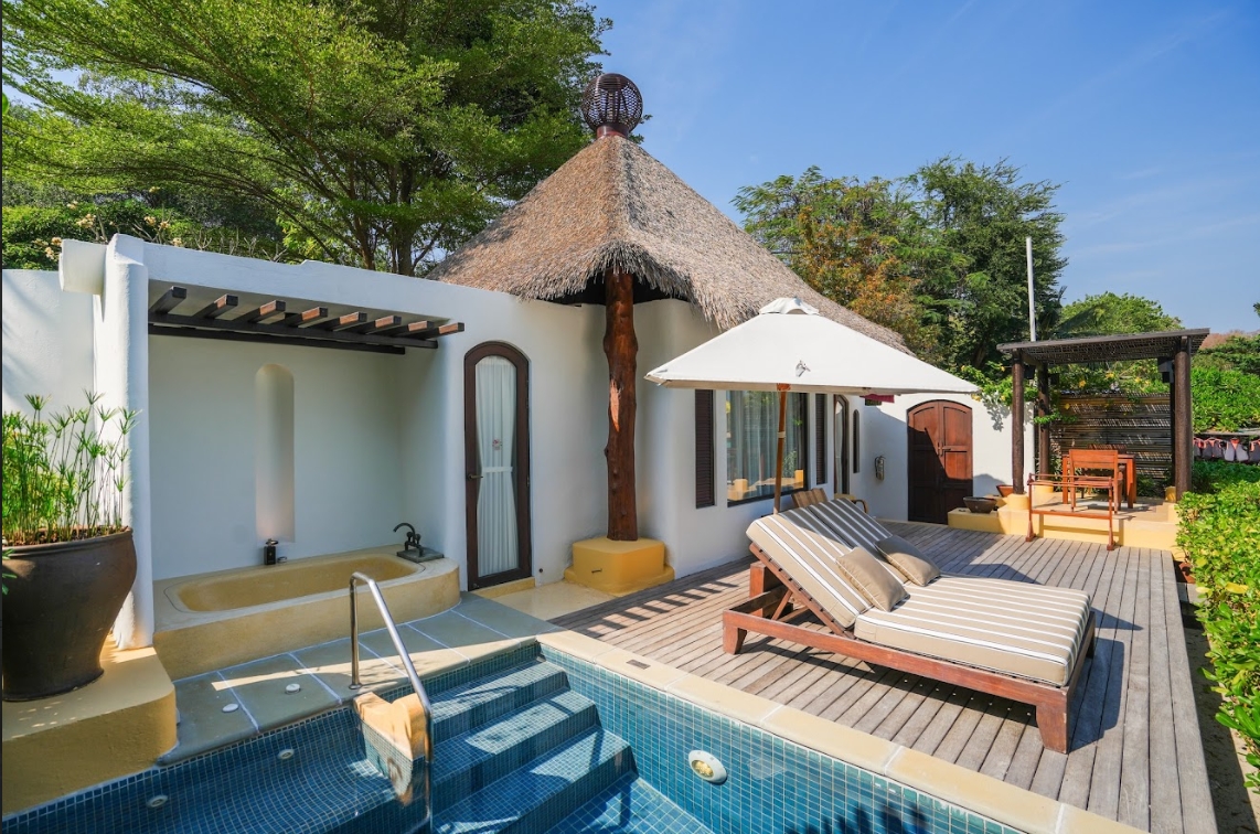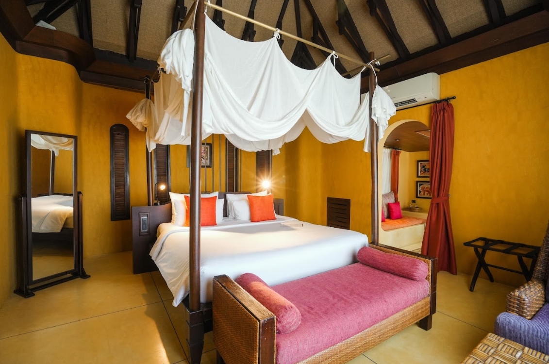 リゾートにはわずか40棟の茅葺き屋根ヴィラがあり、それぞれが100㎡を超える広さを誇るプライベート空間です。タイ産チーク材とシルクの質感を基調に、バリやモロッコのエッセンスを取り入れたインテリアは洗練と異国情緒を感じさせます。広々としたテラスやオープンエアのサラ、専用プランジプールが、贅沢で気ままなひとときを約束してくれます。
